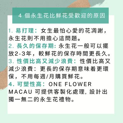 有別於一般鮮花永生花是真花經過特別處理而製成不但保持鮮花的特質更可以擺放在家中作優雅的裝飾品, 營造專屬二人的小確幸!